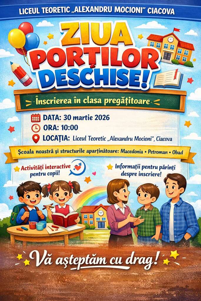 În data de 30.03.2026, se va desfăşura activitatea – ZIUA PORȚILOR DESCHISE la Liceul Teoretic “Alexandru Mocioni” Ciacova şi la şcolile primare arondate.